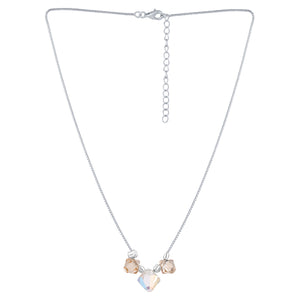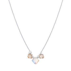 Discover the perfect harmony of modern design and timeless sparkle. This stunning pendant necklace is meticulously crafted to be your go-to accessory, adding a touch of refined glamour to every moment. At the heart of this design lies a captivating trio of high-quality crystals. The central Aurora Borealis crystal catches the light beautifully, shimmering with an ethereal play of colours, while the two flanking champagne crystals provide a warm, elegant contrast.